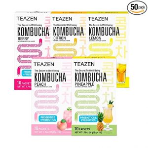 TEAZEN 5 Sabores 50 Sticks Variety Pack, Kombucha Pêssego, Abacaxi, Limão, Cítrico, Sabor Berry (8,8 oz, 50 Sticks)